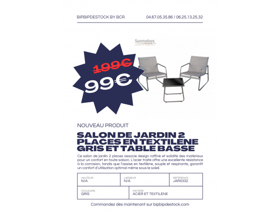 0-01JAR0332 Salon de jardin 2 places en textilène gris